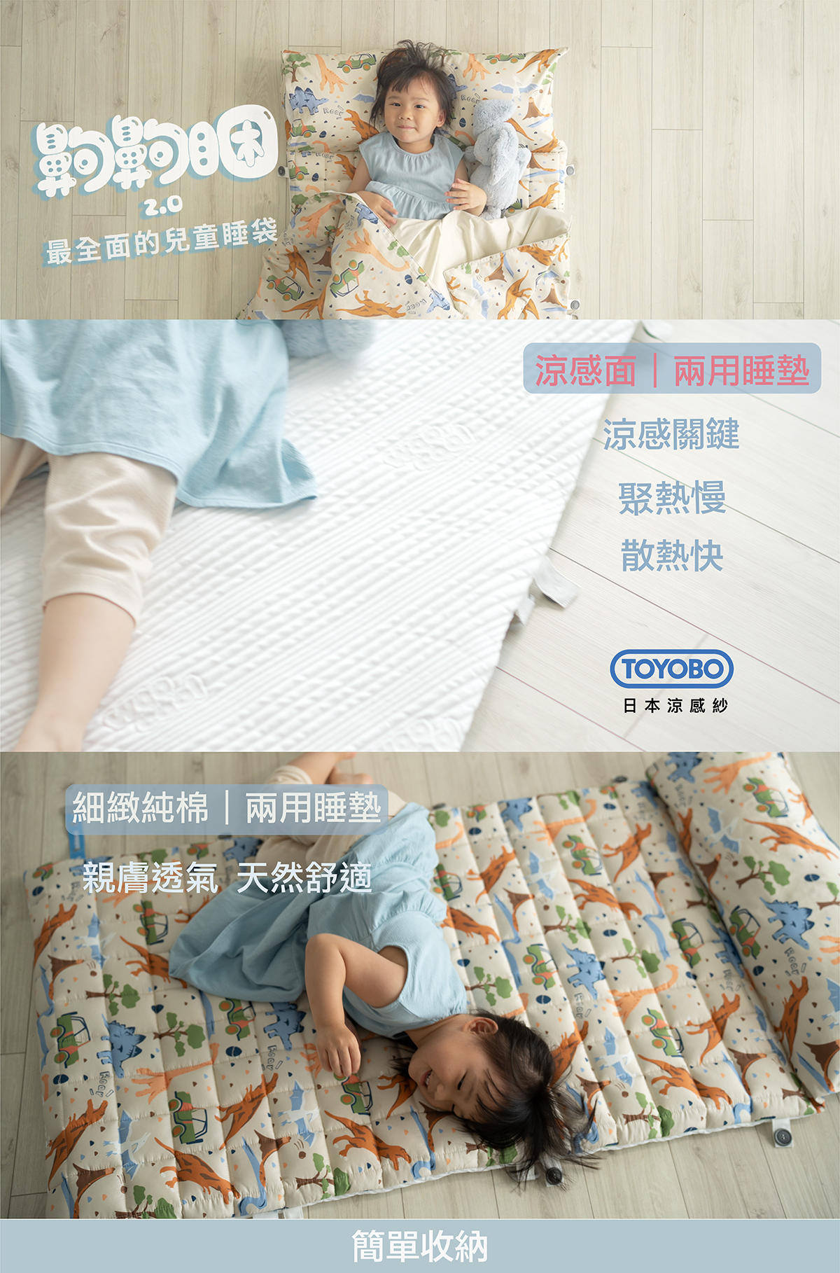 最全面的小朋友睡袋(幼稚園睡袋),兩用睡墊:天冷細緻純棉和夏日真有感日本TOYOBO涼感面料,石墨烯恆溫四季被,全新簡單的收納方式,再升級螺旋珍珠棉枕心,防潑水收納袋再加大,睡眠再升級。